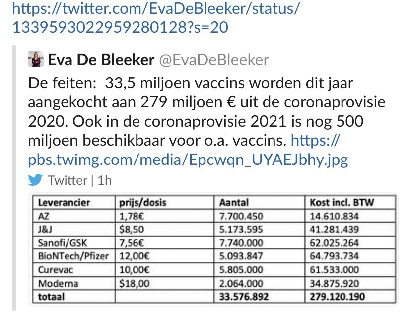Belçikada büdcə və istehlakçıların hüquqlarının qorunmasında cavabdeh olan nazir Eva De Blekeer dərman istehsalçıları ilə razılaşdırıldığı və gizli qalmalı olan koronavirus peyvəndlərinin qiymətlərini səhvən Twitter hesabında paylaşıb.